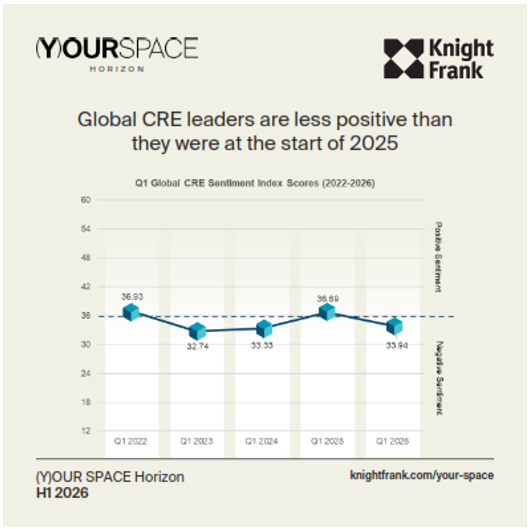 It found global CRE leaders were more cautious than they were at the start of 2025, with Knight Frank’s Global Corporate Real Estate Sentiment Index at 33.94 compared to 36.69, with negative macroeconomic sentiment putting a brake on ambition to expand footprints.